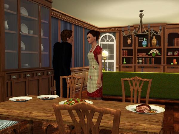 Rhonda waited in the dining room, watching him watch the fire. He finally seemed to realized that she was waiting for him to come eat and approached the table.