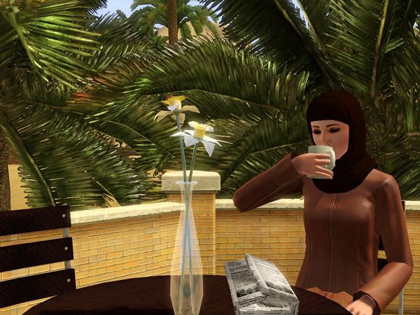 On the balcony of a small cafe, Rhonda shielded her eyes and sipped chilled mint tea. Her new clothes were elegant, unfamiliar, and smothering. Her hair was covered. Her glasses were in her purse back at the hotel. She wore no makeup. She couldn’t afford to be recognized now.