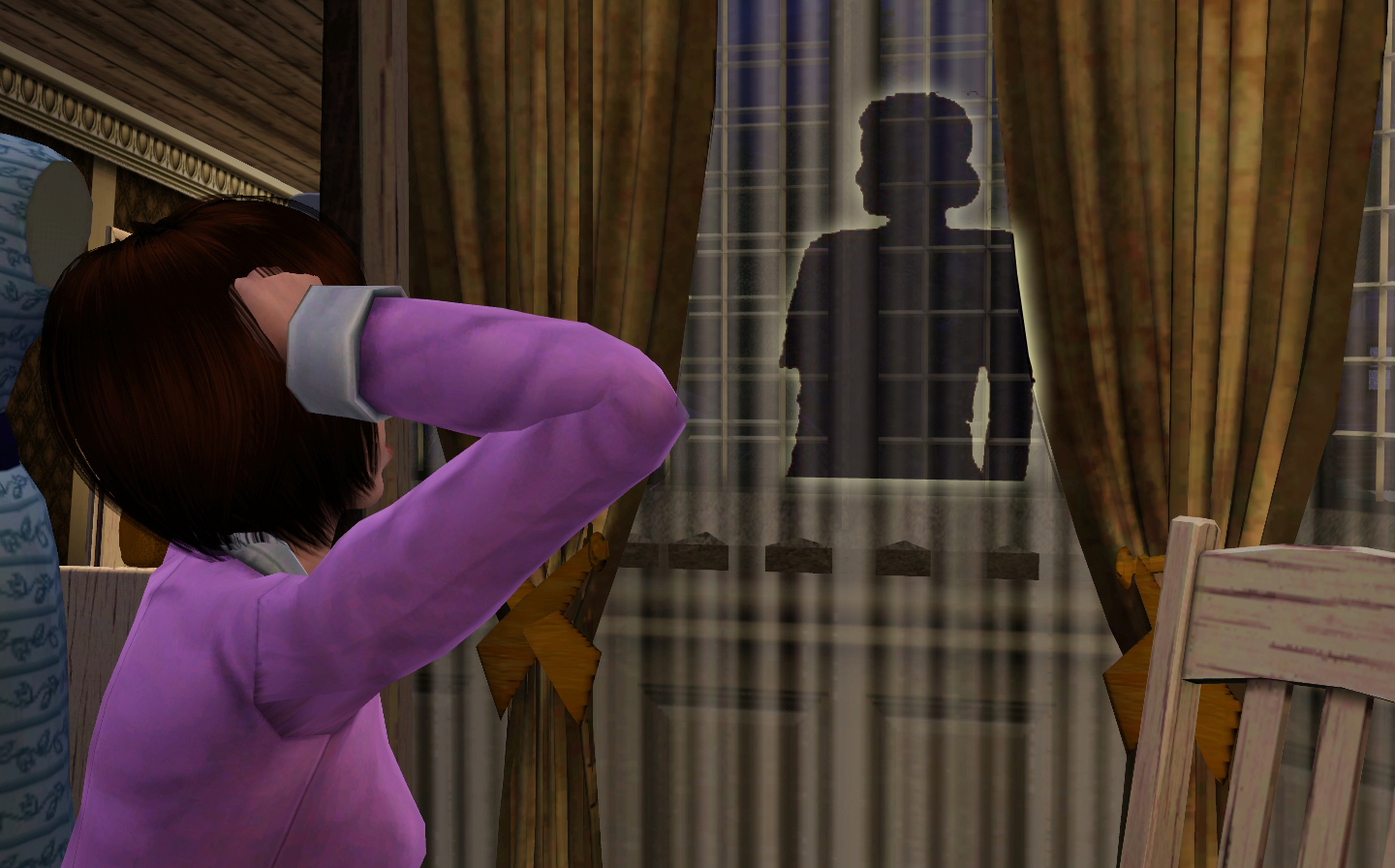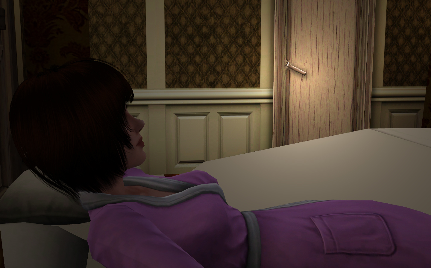 She woke up to a strange sound in the middle of the night…. It was the door handle! It was moving! Somebody wanted to come into her bedroom! She got up and quickly pushed the dresser in front of the door.